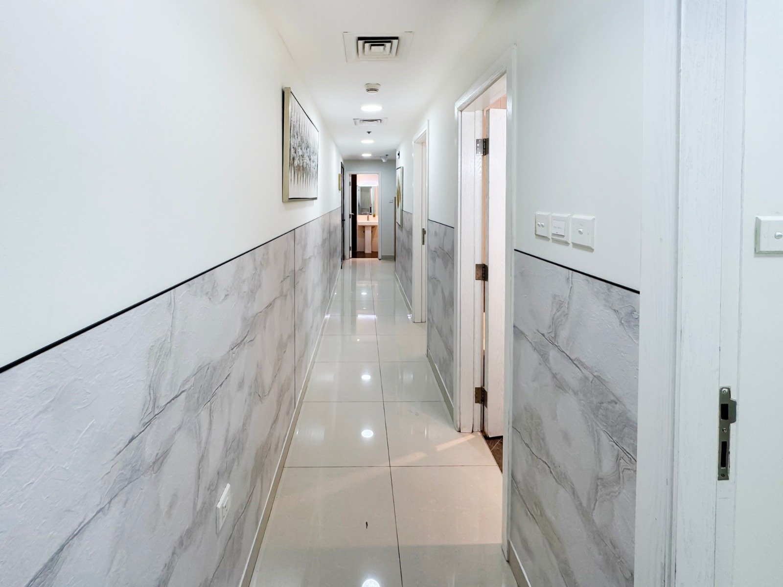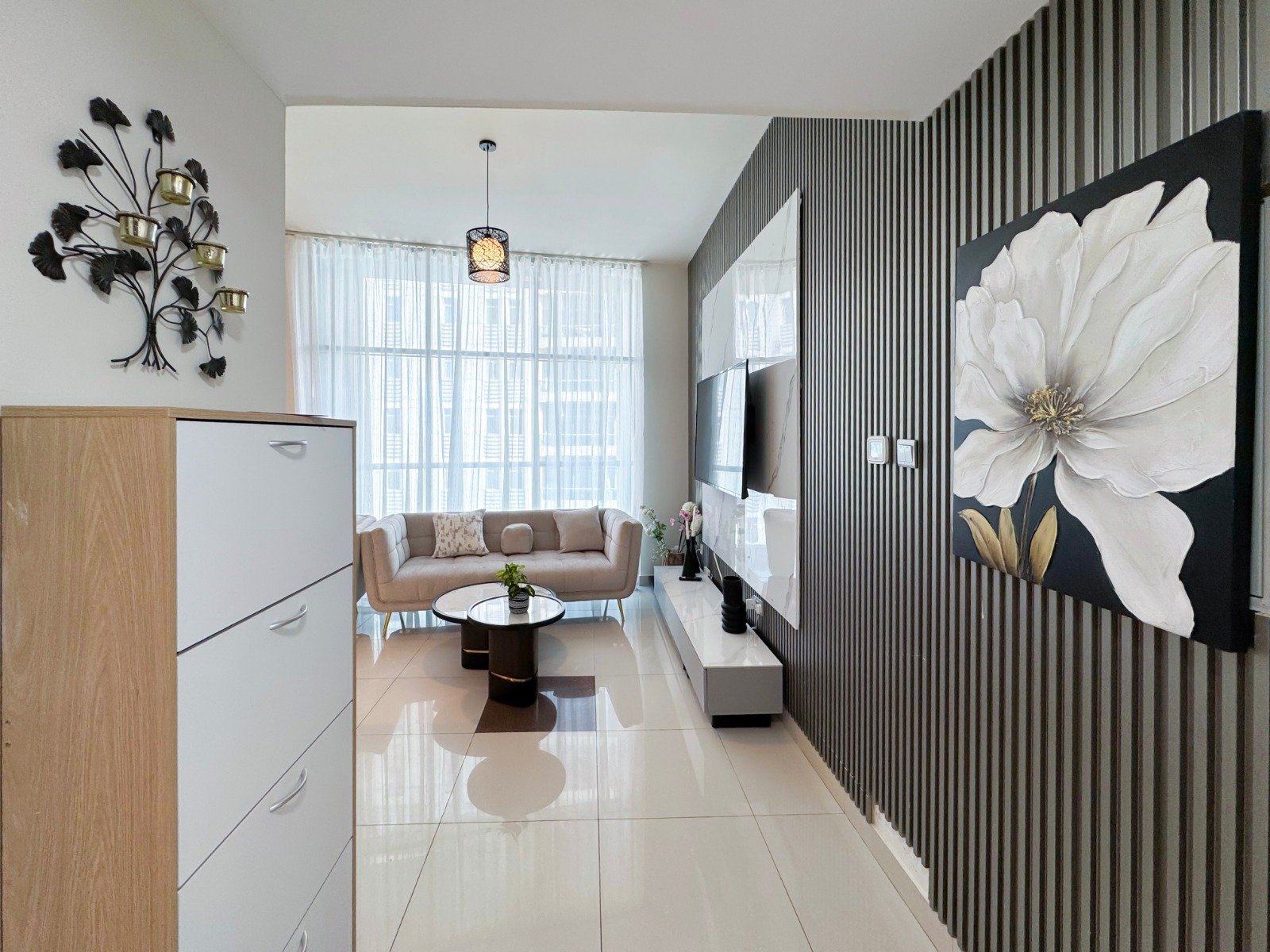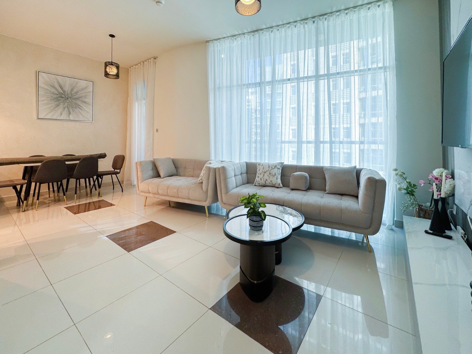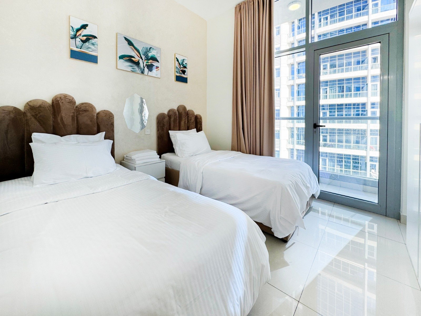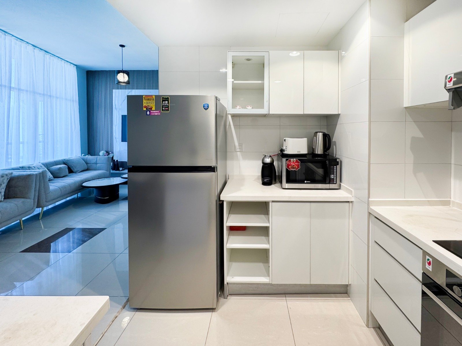 Dubai Marina luxury short-term apartment, JBR beach 5 minutes walking, tram station 2 minutes walking, metro 6 minutes walking and around supermarket, restaurants, and cafes.